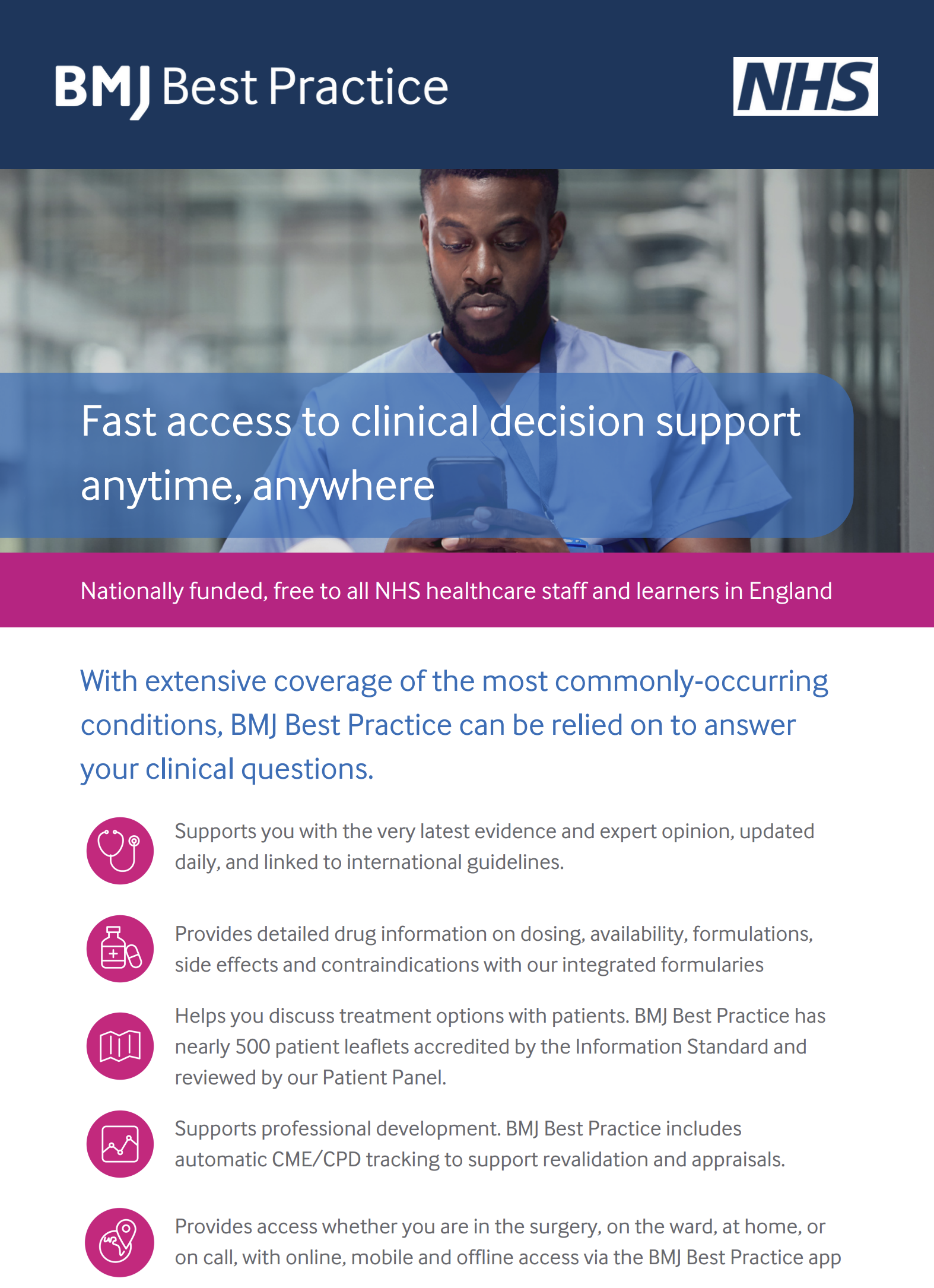 As a clinical champion, you have the flexibility to promote BMJ Best Practice as and when opportunities arise. You are recognised as key contributors to the continuous development of the tool and undertake a valuable role in the campaign to ensure that all NHS staff are aware of and are confident in the use of BMJ Best Practice.